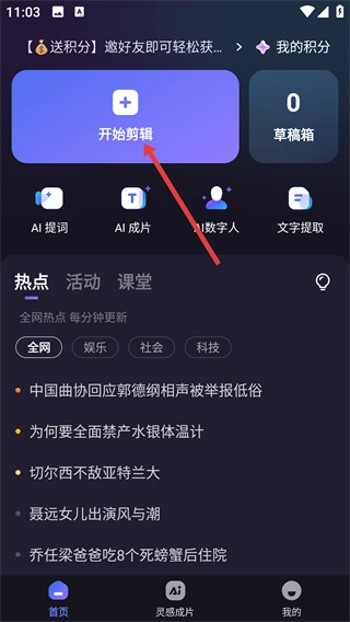 1、在首页点击“开始剪辑”按钮,即可进入素材选择界面,在此界面还能查看AI题词、AI成片等功能选项。