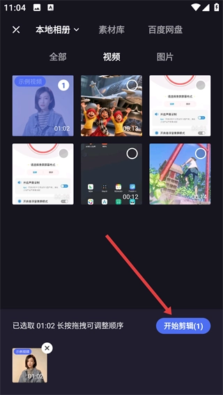2、在本地相册界面挑选需要剪辑的素材,确定选择后点击“开始剪辑”按钮,进入视频编辑界面。