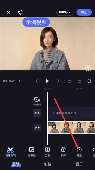 3、进入视频剪辑界面后,在底部的功能栏里找到“变速”选项并点击,就能对视频的播放速度进行调整。