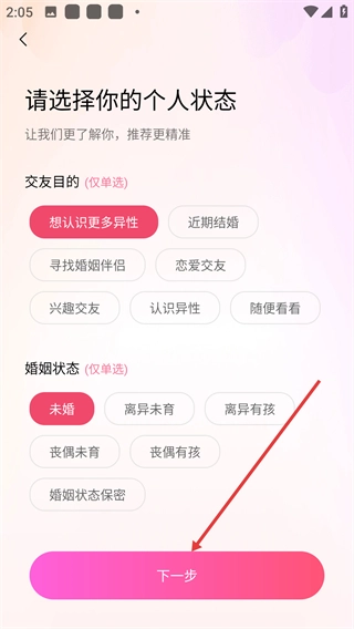 3、进入个人状态选择页面后,需依次选择交友目的与婚姻状态(两者均为单选选项),完成选择后点击【下一步】按钮,即可进入账号信息填写环节。