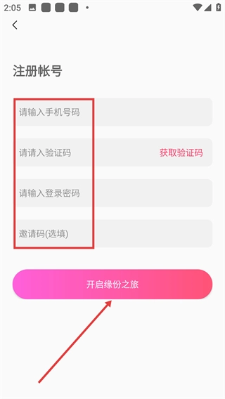 4、进入注册账号页面后,需填写号码、获取并输入验证码、设置登录密码(邀请码为选填项),完成这些操作后点击【开启缘分之旅】按钮即可完成注册。
