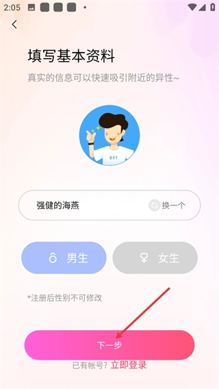 2、进入基本资料填写页面后,需选择昵称(支持更换)和性别(注册后无法修改),完成选择后点击【下一步】按钮,继续后续的注册流程。