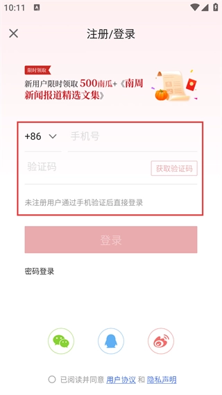 3、在注册或登录界面,选择验证码登录的方式,填写【号】并获取【验证码】,为完成账号登录做准备。