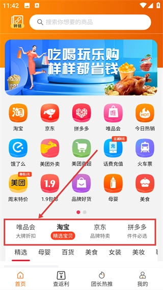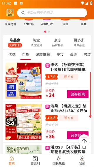 1、打开优惠购物应用的首页后,挑选想要的目标平台(例如【唯品会】),接着切换到该平台对应的商品列表页面。