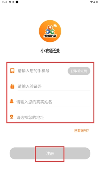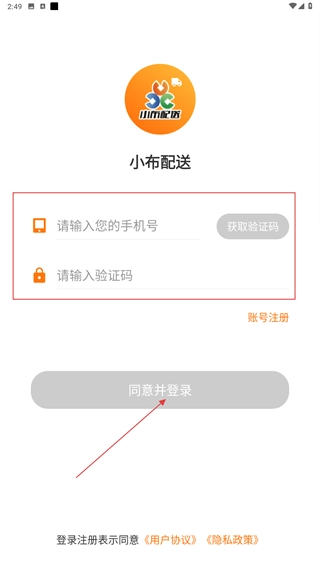 1、在【小布配送】的登录页面,输入账号、获取并填写验证码后,点击【同意并登录】按钮完成账号验证,即可进入应用。