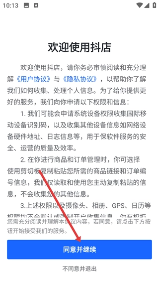 1、仔细阅读【抖店】平台的【用户协议】与【隐私协议】,在充分了解平台权限申请相关规则后,点击【同意并继续】按钮,即可进入下一步操作环节。