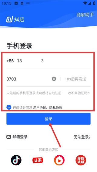 2、在【抖店】的登录页面,输入账号和验证码,勾选相关协议后点击【登录】按钮,即可完成账号验证流程。