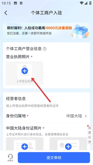 4、进入【个体工商户入驻】界面后,点击【上传营业执照】的区域来添加所需材料,之后补充完整经营者信息,再提交审核即可。