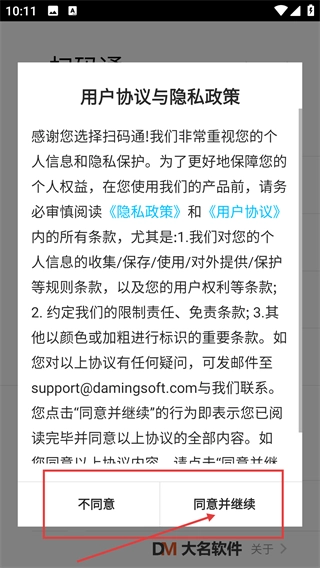 1、启动【扫码通】后,会弹出【用户协议与隐私政策】的提示窗口,点击【同意并继续】按钮即可进入软件的主界面。
