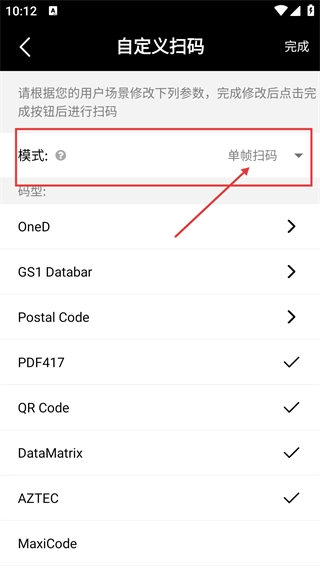 3、进入【自定义扫码】页面后,点击【模式】选项旁的下拉按钮,即可展开扫码模式的选择菜单。