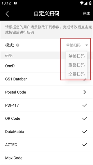 4、在模式下拉菜单中,能够选择【单帧扫码】【重叠扫码】【全景扫码】等模式,以匹配相应的扫码需求。