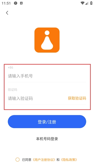 3、在登录/注册页面,填写号码、点击【获取验证码】并输入收到的验证码,点击【登录/注册】按钮,即可完成账号注册或登录操作。