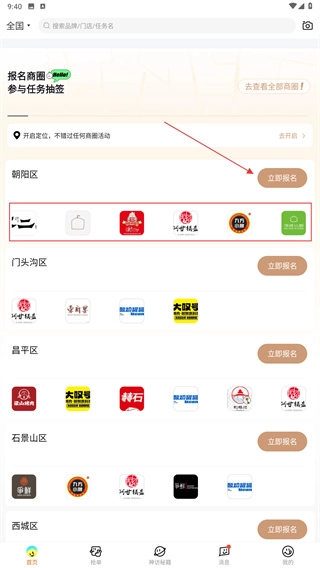 1、打开嗨探APP进入主界面,找到报名商圈板块,从中选择【朝阳区】,然后点击该区域对应的【立即报名】按钮,即可参与任务抽签。