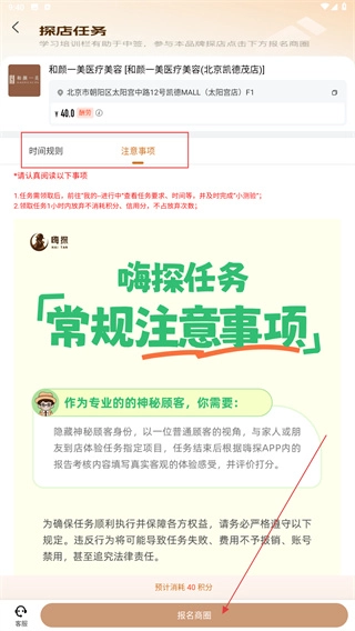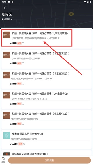 3、从品牌店铺列表里挑选具体的店铺,比如【和颜一美医疗美容(北京凯德茂店)】,然后查看探店酬劳【40.0】以及其他相关详情。
