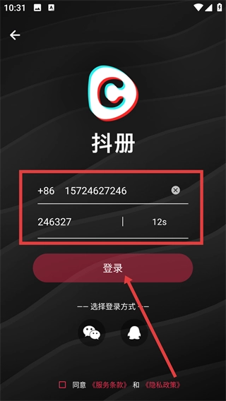 3、在【抖册】的登录界面输入账号和验证码,完成登录信息的填写环节。