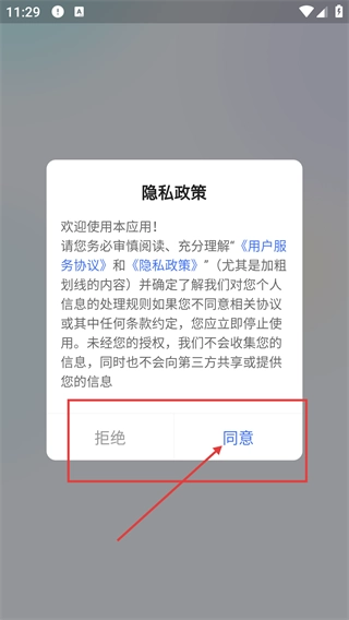 1、启动软件后,会弹出【隐私政策】的提示窗口,点击【同意】按钮即可进入下一步的登录或注册界面。