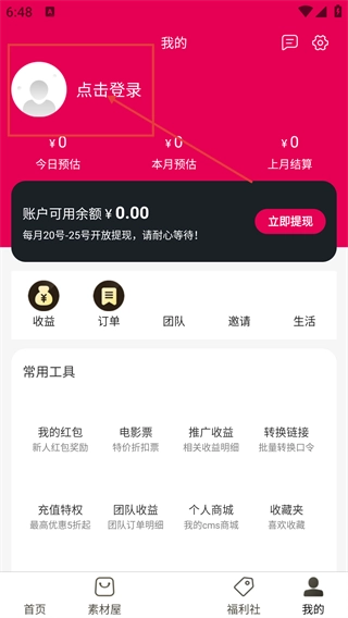 2、进入“我的”页面后,点击【点击登录】区域,即可跳转至账号登录的选择界面。