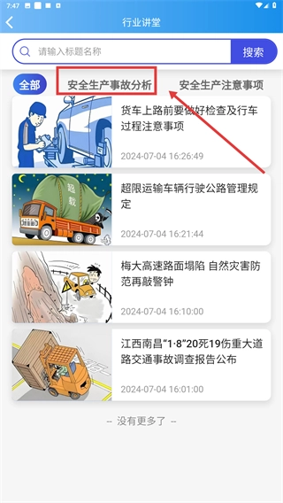 在行业讲堂页面,点击【安全生产事故分析】分类标签,就能筛选出该主题下的内容列表,以便集中查看事故类专业信息。