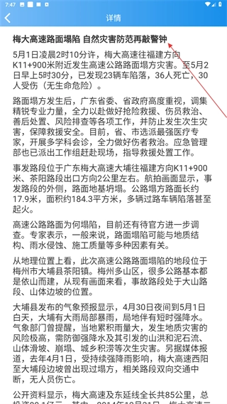 3、在分类列表中点击目标文章(例如《梅大高速路面塌陷自然灾害防范再敲警钟》),就能进入文章详情页面查看具体内容。