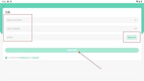 2、进入【注册】页面,填写账号、密码,点击【获取验证码】并填写,勾选协议后点击【注册并登录】,即可完成账号的注册与登录操作。