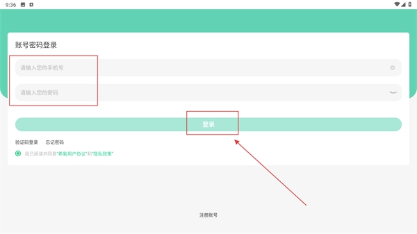 1、进入【账号密码登录】界面后,按顺序输入账号和密码,勾选相关协议,随后点击【登录】按钮,即可完成账号登录流程。