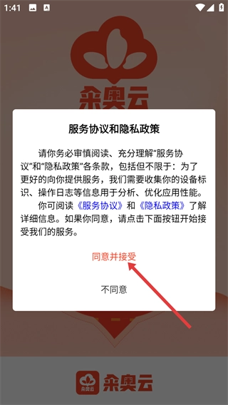 1、仔细阅读《服务协议》与《隐私政策》的内容后,点击“同意并接受”按钮,即可继续推进应用的使用流程。