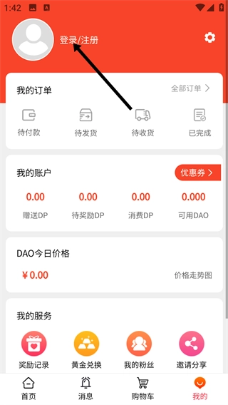 2、进入“我的”页面,点击“登录/注册”选项,进入账号的登录相关界面。