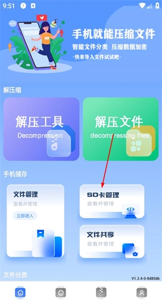 1、启动软件后,进入主界面,找到SD卡管理功能,点击进入SD卡文件列表界面。