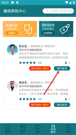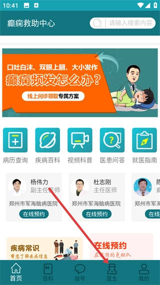 1、在【癫痫救助中心】首页,点击底部的【医生】按钮,即可进入医生相关页面;首页还包含【病历查询】、【疾病百科】等功能板块。