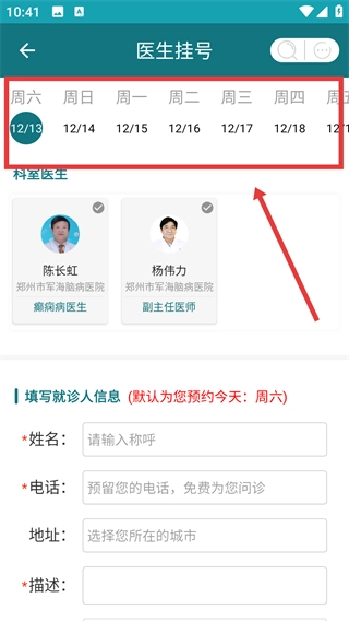 3、在【医生挂号】页面选择就诊日期(例如12/13),选好对应的医生后,就会进入就诊人信息的填写界面。