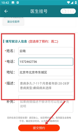 4、在就诊人信息栏填写【姓名】、【电话】和【地址】,补充病情描述后,点击【提交预约】按钮即可完成挂号申请。