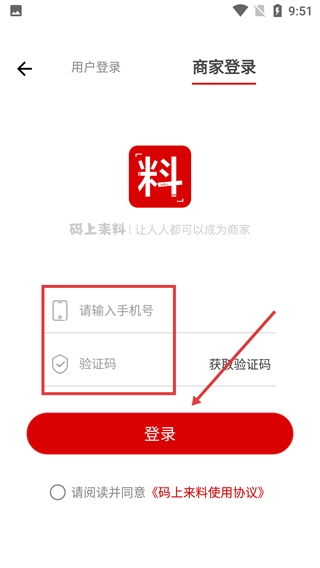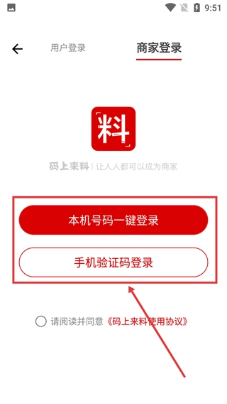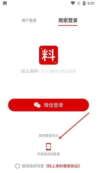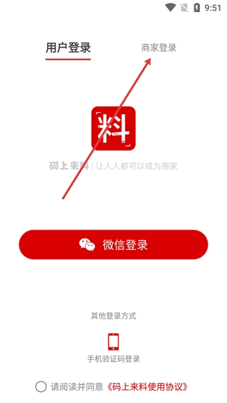 1、在登录页面,点击【商家登录】选项,即可切换到商家身份对应的登录界面。