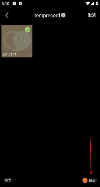 2、进入temprecord页面后,选中需要处理的目标视频,接着点击页面右下角的确定按钮,即可进入视频编辑环节。