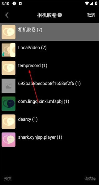 1、启动软件后,进入相机胶卷界面,浏览文件列表,找到并选择temprecord文件夹,点击进入该文件夹查看其中的内容。