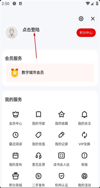 进入页面后,会看到“点击登录”提示以及会员服务等选项,点击这个“点击登录”提示,就能进入账号登录页面。