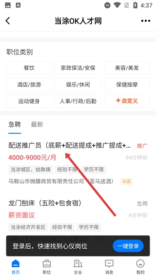 4、在当涂OK人才网页面,能够查看各类职位信息(例如配送推广员、龙门刨床等岗位),知晓岗位薪资、工作地点等具体情况。