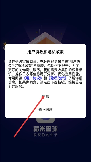 1、仔细阅读稻米星球的《用户协议》和《隐私政策》条款内容后,点击“同意”按钮,即可继续进行应用的使用流程。