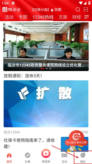 1、在【临汾云】首页,点击底部的【我的】选项,就能进入个人中心页面,这是进行账号相关操作的前置步骤。