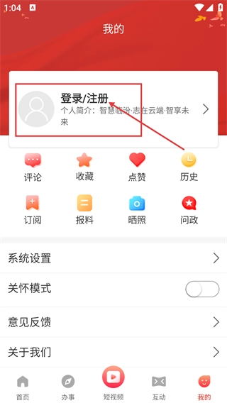 2、进入【我的】页面后,点击【登录/注册】区域,即可进入账号的登录或注册界面,进而推进账号绑定流程。