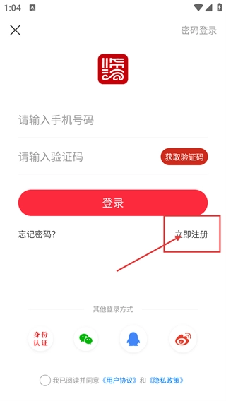 3、在登录界面里,点击【立即注册】按钮,就能切换到注册页面,为账号注册操作做准备。