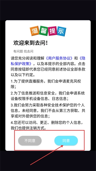 1、进入【去问】后,仔细阅读【用户服务协议】、【隐私保护政策】以及温馨提示的相关内容,随后点击【同意】按钮,即可进入后续页面。