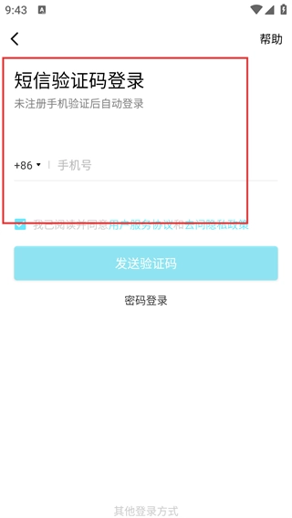 2、进入【短信验证码登录】页面,输入【号】,勾选协议后点击【发送验证码】完成验证步骤。