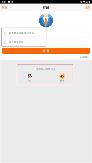 2、在登录界面,用户既可以通过输入【邮箱/电话号码-密码】的方式登录,也能够选择【QQ-微博】这类第三方账号进行快捷登录。