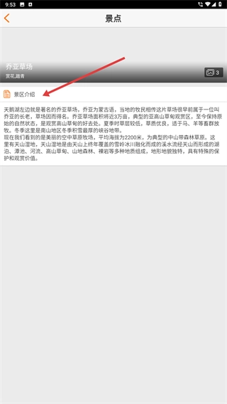 4、进入乔亚草场详情页面,查看【景区介绍】部分,就能了解该景点的名称由来、地理特征等相关信息。