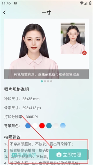 2、进入【一寸】证件照页面,查看【25x35mm】的规格说明以及拍照建议,然后点击【立即拍照】按钮进入拍摄界面。