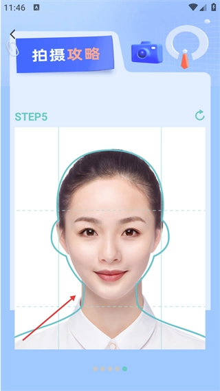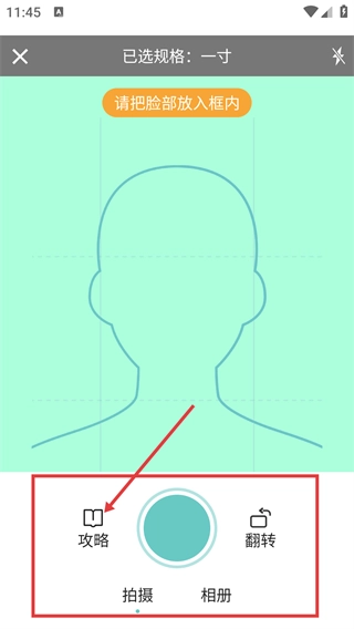 4、点击【攻略】查看拍摄步骤,将脸部放入对应框内并参照示例,完成证件照拍摄的前期准备。