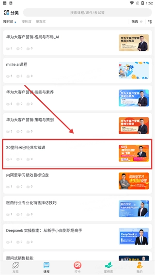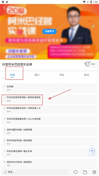 2、在课程列表中找到目标课程(例如“20堂阿米巴经营实战课”),点击进入该课程的详情页面。