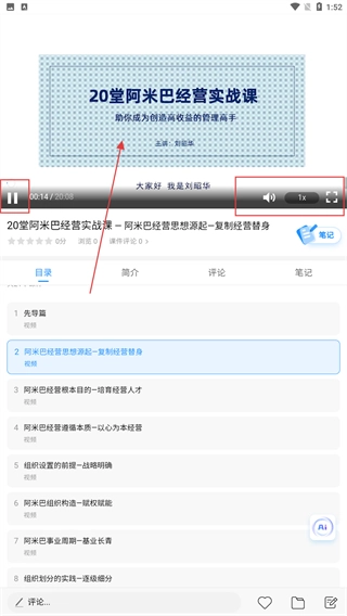 4、进入课程播放页面后,可借助暂停键、音量/倍速调节、全屏按钮等功能,来把控学习进度并优化播放体验。