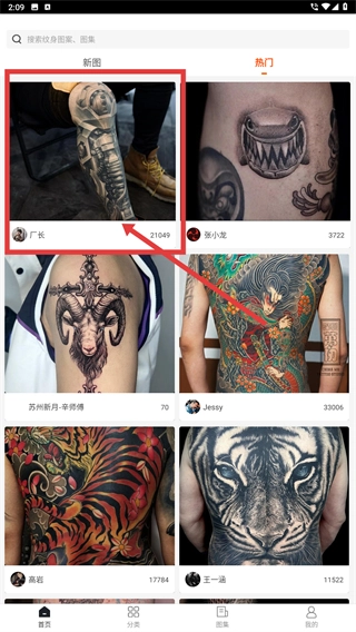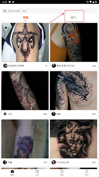 1、打开纹身图案大全应用,进入首页后点击顶部的【热门】标签,即可切换到热门纹身作品列表,浏览高人气的纹身内容。