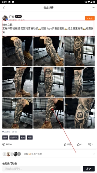 2、在热门列表里,挑选你想了解的纹身作品(比如“厂长”发布的机械腿纹身),点进去动态详情页就能查看作品的具体细节了。